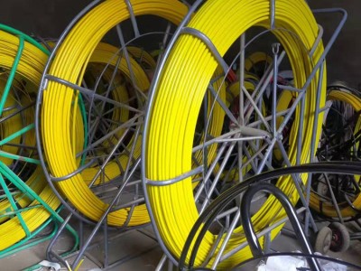玻璃钢穿孔器又名(玻璃钢穿线器、玻璃钢穿管器,穿孔器,穿管器,电缆穿管器,电缆穿孔器)对于在管道中牵引引导绳是辅助工具。光滑又富于弹性的表面可使穿孔器轻松地通过狭窄的通道。穿孔器由三部分构成:铜芯、玻璃纤维加强层、高压低密度聚乙烯防护层(平滑、坚固,可抵抗恶劣环境)。铜芯导体使捅条可以用不同方式轻易安放。璃钢穿孔器具有省时,省力,提高工效等优点,可用于电信管道清洗及光缆,电缆和塑料子管的布放。使用时首先将玻璃钢覆杆由引轮引出,然后与相应的金属头联接,穿入管路内。用于清理时,引导头带动清理工具,可以清理管道;用于布放电缆时,可先将钢丝或铁线带入,尔后用钢丝或铁线牵引电缆入管。杆 11-18mm 100-500m 温度范围 -40+80小弯曲半径 295mm 牵引断裂张力 4.5T 线密度 150g/m 建筑施工引线用墙壁穿线器,长度30m40m60m80m120m150M200M300M500M 1000米等,可按客户要求定制。