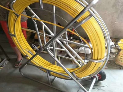 玻璃钢穿孔器又名(玻璃钢穿线器、玻璃钢穿管器,穿孔器,穿管器,电缆穿管器,电缆穿孔器)对于在管道中牵引引导绳是辅助工具。光滑又富于弹性的表面可使穿孔器轻松地通过狭窄的通道。穿孔器由三部分构成:铜芯、玻璃纤维加强层、高压低密度聚乙烯防护层(平滑、坚固,可抵抗恶劣环境)。铜芯导体使捅条可以用不同方式轻易安放。璃钢穿孔器具有省时,省力,提高工效等优点,可用于电信管道清洗及光缆,电缆和塑料子管的布放。使用时首先将玻璃钢覆杆由引轮引出,然后与相应的金属头联接,穿入管路内。用于清理时,引导头带动清理工具,可以清理管道;用于布放电缆时,可先将钢丝或铁线带入,尔后用钢丝或铁线牵引电缆入管。杆 11-18mm 100-500m 温度范围 -40+80小弯曲半径 295mm 牵引断裂张力 4.5T 线密度 150g/m 建筑施工引线用墙壁穿线器,长度30m40m60m80m120m150M200M300M500M 1000米等,可按客户要求定制。