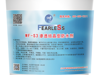 WF-S3渗透结晶型防水剂为无机高渗透斥水型防水剂,通过表面渗透基材,与水分子和游离碱发生硅化反应生成深层面的基团。防水剂可渗透基材10mm以上,可有效阻止基材渗水、返潮,且能够弥补0.4mm以下细小裂缝并具有透气性。不改变基材原有外观及装饰效果。同时具备良好的抗紫外线、耐冰冻、耐高温、耐氯离子侵蚀、耐酸碱能力,斥水效应显著长久。
