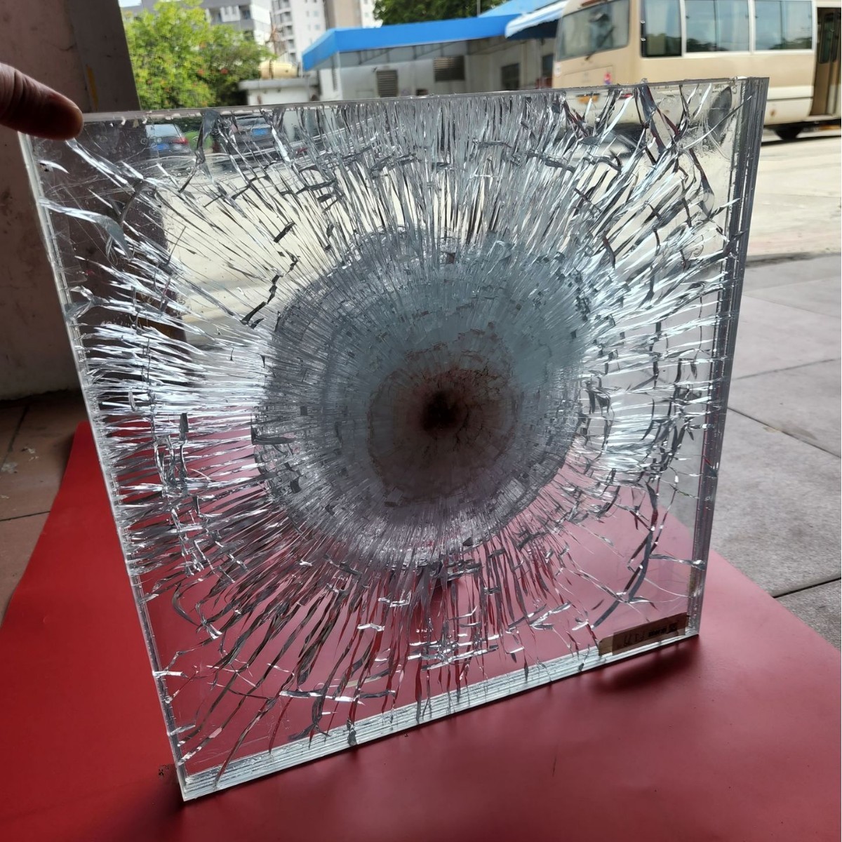 防砸防入侵玻璃,具有高超的耐敲击性能,防击穿功效,使用12j尖锐器物暴力撞击3锤,玻璃的整体性依然保持完好,符合公安部防砸A级标准。