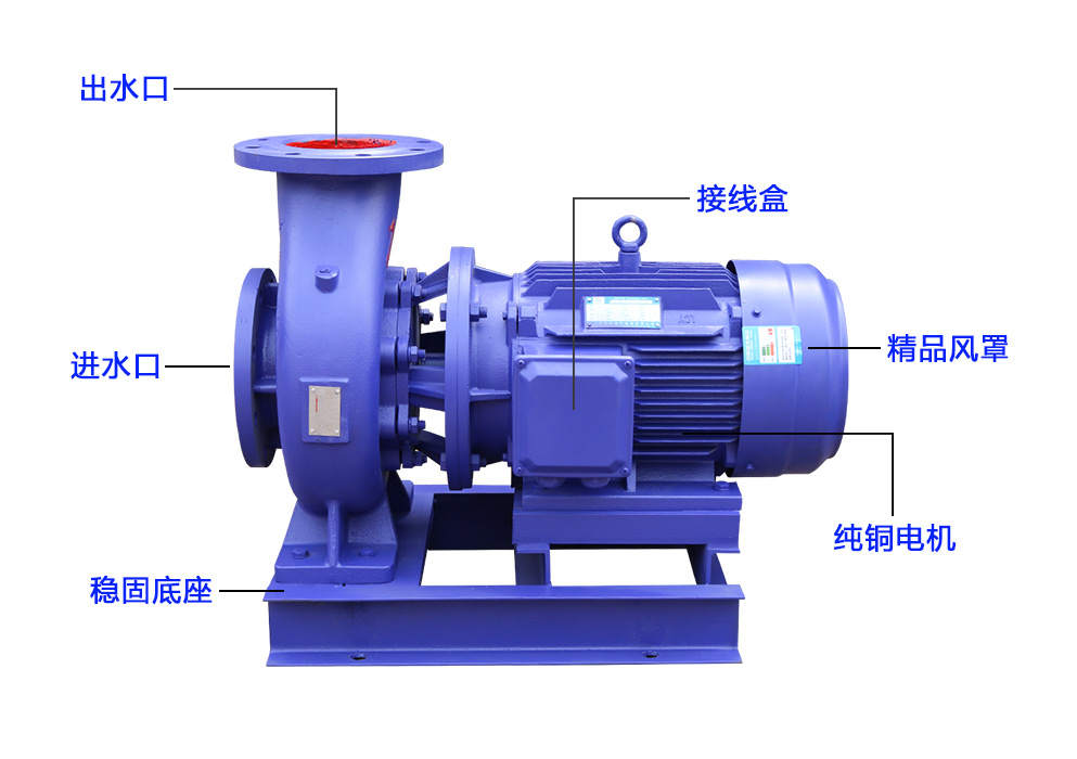 ISW型卧式管道泵启动后,泵轴带动叶轮一起高速旋转,迫使预填充在叶片之间的液体旋转。在惯性离心力的作用下,液体从叶轮中心径向移动到外周。液体在流过叶轮的运动过程中获得能量,静压能量增加,流速增加。当液体离开叶轮并进入泵壳时,由于壳内流道的逐渐膨胀,液体会减速,部分动能转化为静压能,切向流入排放管。ISW型卧式管道泵壳体不仅是收集从叶轮流出的液体的部件,而且还是动力传递装置。当从叶轮的中心向外周投掷液体时,在叶轮的中心形成低压区域,并且由于液体之间的总势能差而将液体吸入叶轮的中心。依靠叶轮的连续运转,液体被连续地吸入和排出。由ISW型卧式管道中的液体获得的机械能转化为静压能的增加。