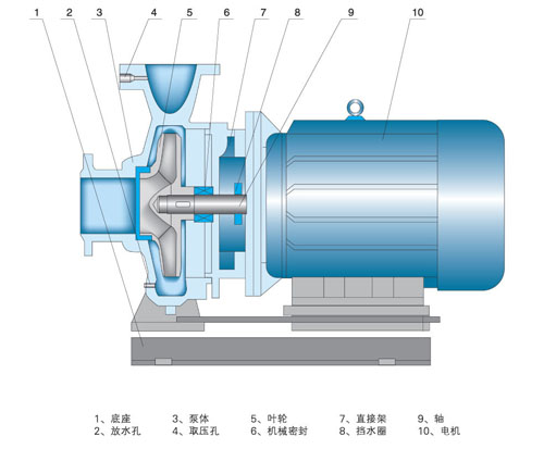 ISW型卧式管道的基本组件是高速旋转叶轮和固定的蜗牛形泵壳。具有多个(通常为4至12个)向后弯曲叶片的叶轮固定在泵轴上,并由电动机驱动,与泵轴一起高速旋转。叶轮是直接对泵中的液体进行功的部件,并且是ISW卧式管道的能量供应装置。泵壳中的吸油口与吸油管相连,吸油管的底部装有单向底阀。泵壳侧面的排出口与装有调节阀的排污管道连接。