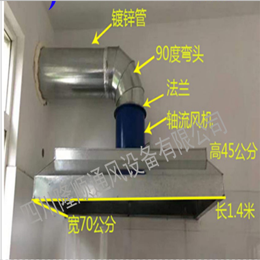 四川隆顺通风设备有限公司,可按照酒店、餐厅的厨房内灶和蒸饭柜的大小,量身定做201或者304不锈钢油烟罩,厨房不锈钢吸烟吸尘罩,我们可为您匹配好挡油板、防爆灯、油壶、排烟风机、烟道、弯头、法兰等,您可以根据实际情况选择简易的厨房排烟系统。