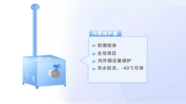 万伯内膜保护器:采用304不锈钢制造,防爆柜体,集成多种保护装置,电子、物理多重控制,保证保护器的可靠性,调压室空气释放和内膜过量保护性排放,从而保证气柜的安全性。万伯内膜保护系统采用控容技术,90%报警,98%排放(PLC控制可调),使内膜不会被装满。所以不受压,也就不泄漏。