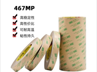 3M467是3M双面胶中一款无基材双面胶,由丙希酸胶直接涂布制成,胶带颜色为透明,厚度较薄,仍具有优良的粘合效果,能防止脱落与优异的防水性能,加工性好,耐温性好,有较好的持粘力;离型纸为聚合物涂层的防水牛皮纸,在高温环境中也不会打皱。