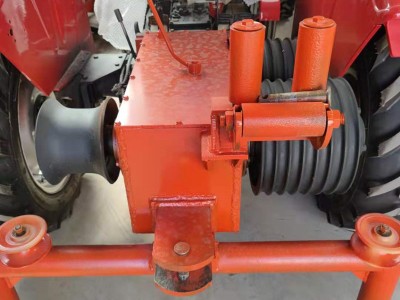 收排线装置牵引箱带有离合拔叉,行驶时拖拉机和牵引箱分离;牵引缠绕钢丝时更为灵活;带有支撑,牵引时轮胎压力减小,整机稳定性好;刹车性