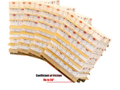 托盘防滑纸是奥立公司续滑托板后又成功开发研制的一种纸张。它可安插在货物和托盘之间,起到防滑和保护产品的作用,放置货物在搬运过程中的滑落或倒塌,使托盘堆垛始终保持整洁美观,减少货物损坏的几率。本品主要用作托盘中间的垫层,货物的层与层之间各放入一张防滑纸,如此阻止了袋子或纸箱的滑动。可有效消除货物在运输过程中的转弯、急刹。加速时产生的力。摩擦系数非常高,正常情况下可保证货物倾斜45度角时不倒塌,最高可达到60角度。