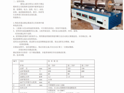 三节炉碳氢元素分析仪,三个电炉都可在轨道上水平移动,并可径向开启45°,炉体内两个平行的管式炉膛,可以一次同时作两个试样的测定。每节电炉都装有热电偶、测温和独立的数显温度控制系统进行温度指示和恒温控制,示温准确,